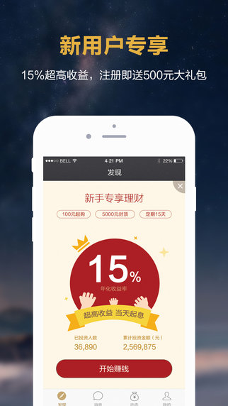 1、 注册即获500元新手礼包,新手专享15%超高收益,