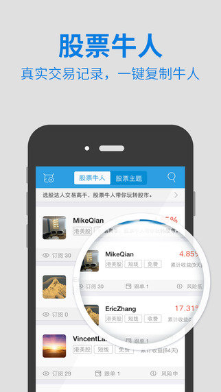 股票圈是一款为广大股民隆重推出的最牛炒股利器软件。每个人都喜欢那种操作简单又能满足自己需求的股票软件,它就是这样一款能够帮助您玩转股票的软件。股票牛人是基于对用户的真实历史交易表现、盈亏情况、交易风格等维度进行科学分析后精选而出。实时跟单,即可享受股市增长带来的高额收益。可购买专业投资经理或者民间高手创建的主题,随时查看投资主题的收益表现,还能方便地变更或者卖出主题。