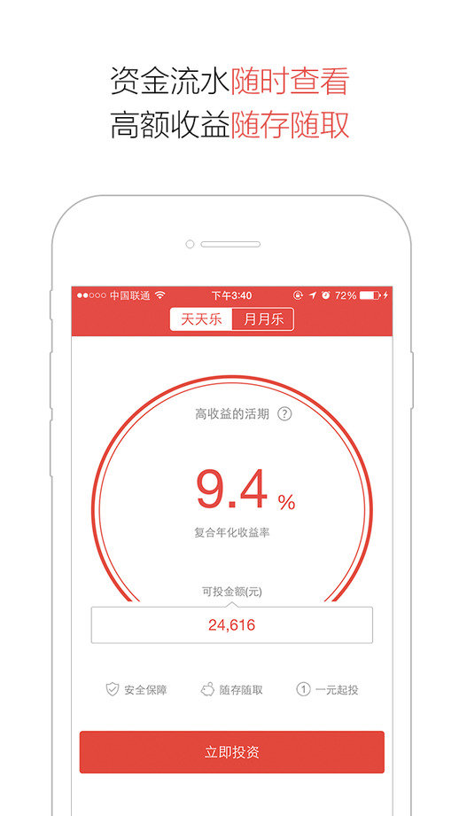 100+优质金融机构和1000+优质T+1、随时可赎回及1个月以内的优质产品打包组合生成的一款1元起投、100%安全保障的高收益活期产品。