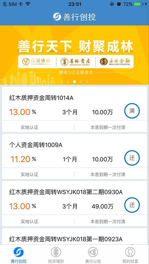 善行创投是一个互联网投资理财平台,精选优质商品,便捷安全理财,高收益,低门槛,高安全,赎回快,你还在犹豫什么,抓紧下载吧!!!