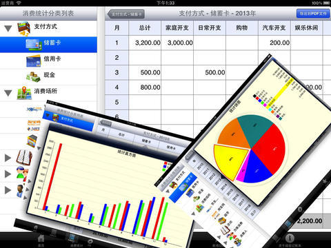 图表支持:对当天,当月,当年,前几年的交易记录,通过饼图可查看交易份额,或通过直方图查看交易趋向,更支持二级分类图表。