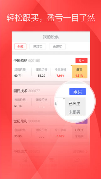 我们对股票池内的股票提供了模拟跟买功能,你只需一键跟买,就能轻松体验跟庄赚。