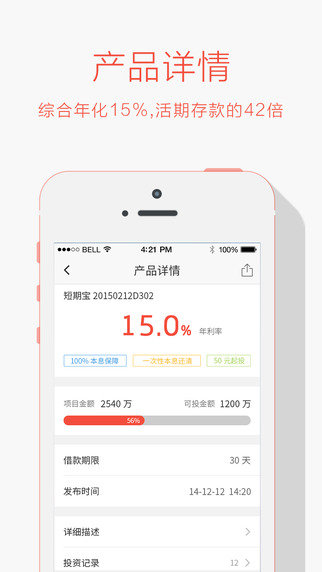 1、 灵活性便捷式高收益理财:50元起投,产品收益15%左右,是银行活期收益的40倍