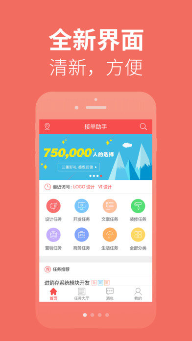 接单助手是一款接单类软件,全新界面,清新方便,附近交易,高效省心。随时随地承接订单,掌握任务动态,让赚钱创业更简单。提供设计、开发、文案、装修、营销等多种分类任务,赚外快、做兼职之首选。一品威客网,改变您的工作方式。