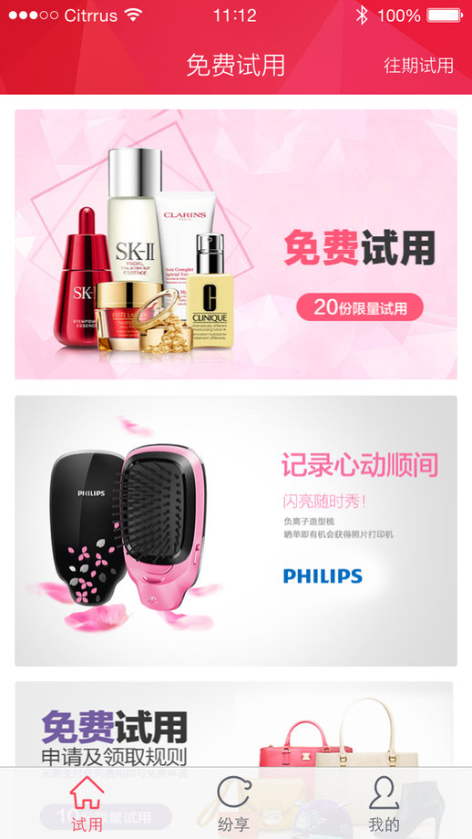 在纷享你还可以有免费的商品试玩,只要你动动手指参与,说不定这个试用的机会就是你的哟!