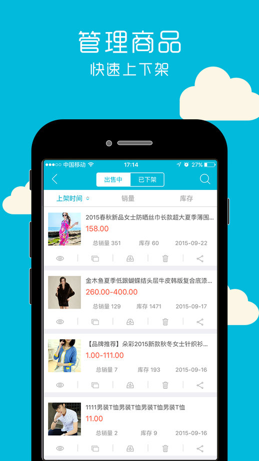 1.商品管理:提供商品上下架、删除、分享等常用操作入口