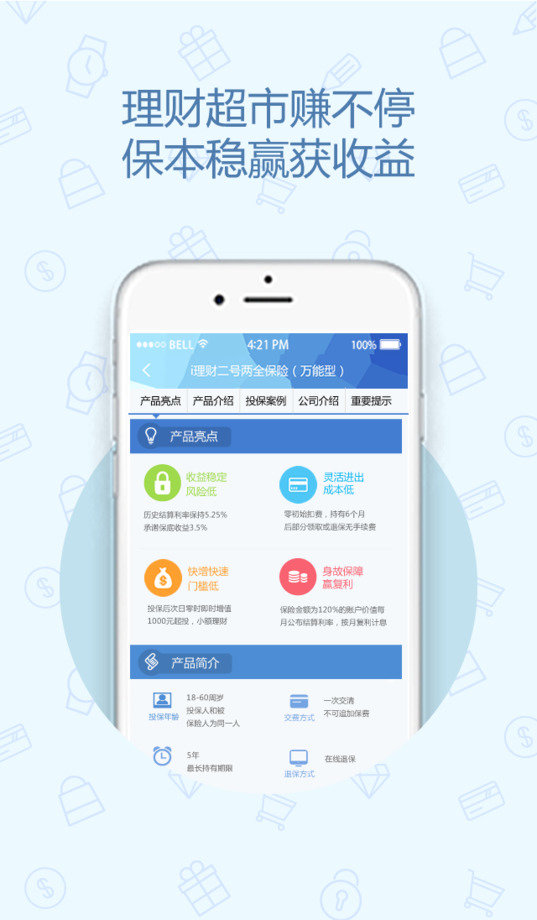 2、精选产品,低风险——提供最具保障的保险理财产品,交易安全可信赖。