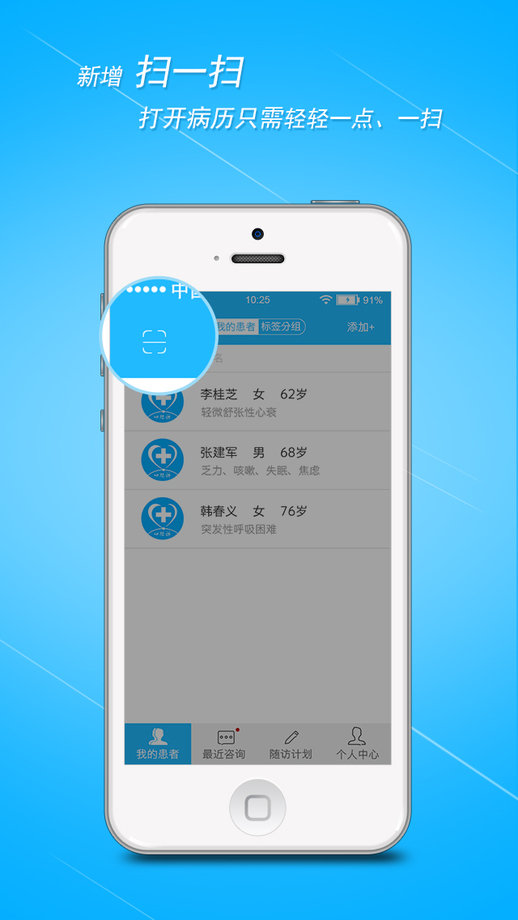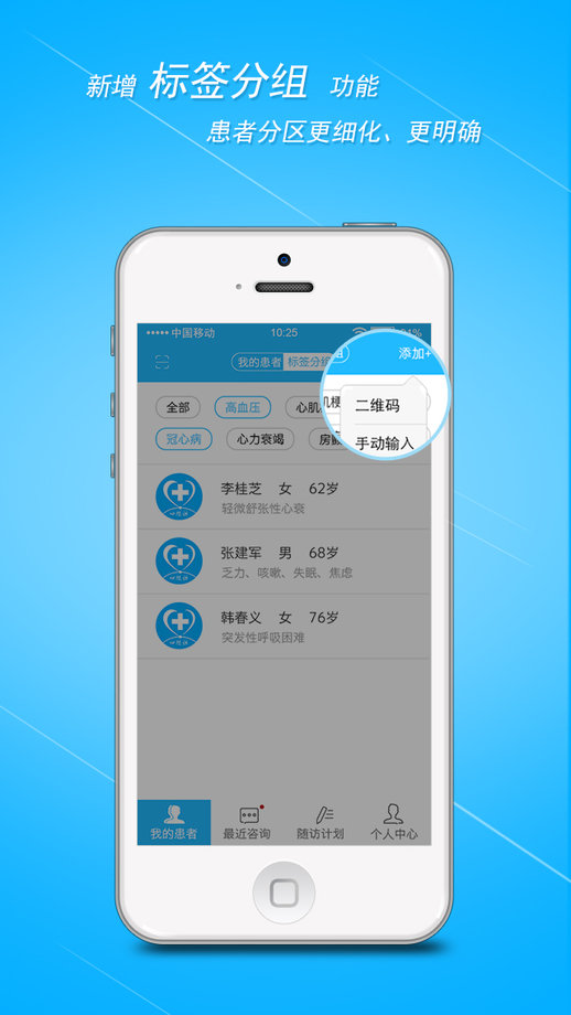 1、患者管理灵活:医生可以手动输入添加自己诊疗过的患者,也可以让患者通过微信扫描自己的二维码加入