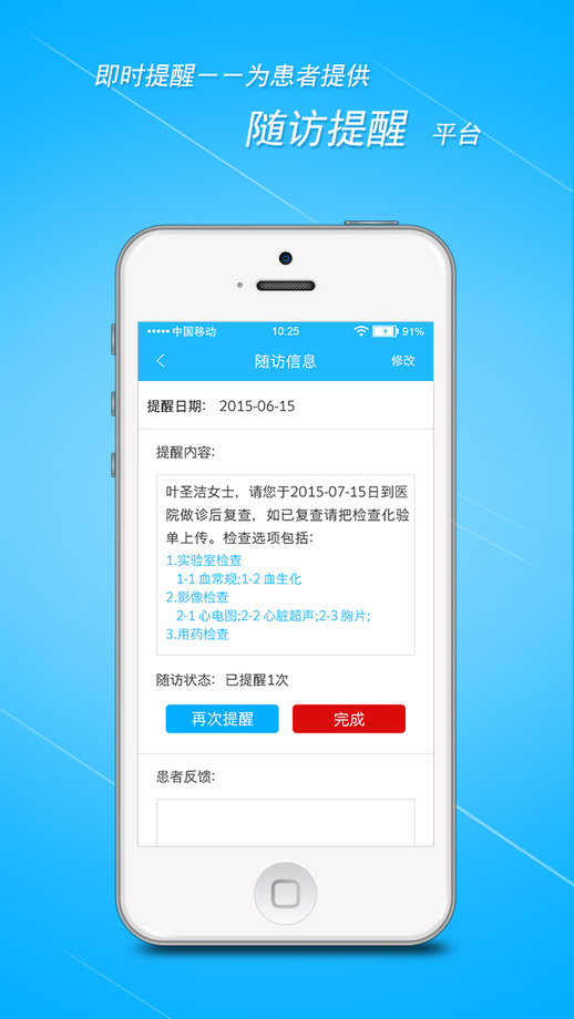 5、智能提醒:APP可根据医生制定的随访计划自动提醒医生对患者进行随访,同时,系统会通过微信提醒患者近期的随访计划。