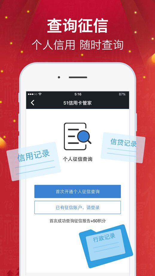 51信用卡管家为您提供:智能账单管理、还款提醒、支付宝&微信还款、快速办卡、薅羊毛攻略、快速借款、人品投资等一站式服务,让您用卡无忧!
