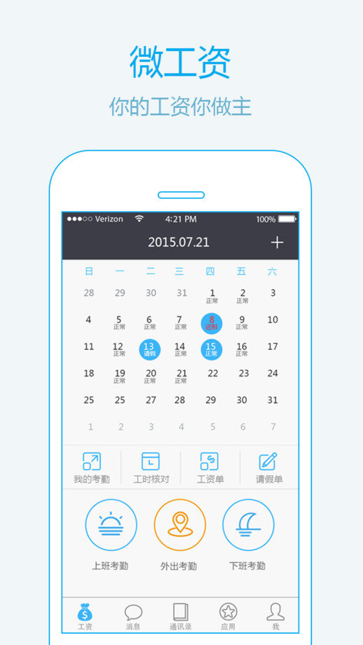 微工资让你工资你做主,精确定位,考勤外出一手掌控;快速发放解放财务,实时审批高效办公,工作沟通精彩生活。
