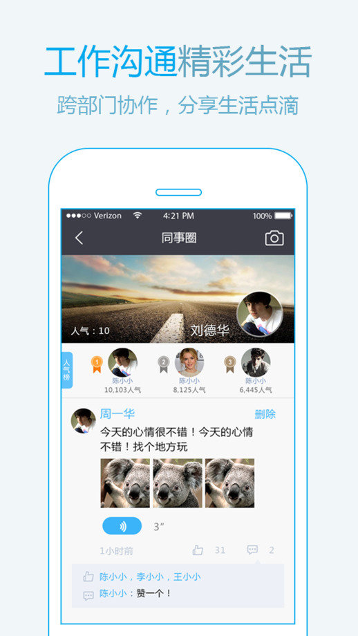 无需添加好友,即可发送图文、语音,同事圈分享,让你工作不孤单,今天,你不是一个人在战斗。