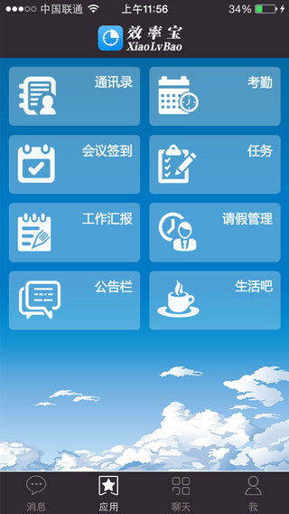 效率宝是一款专为企业打造的手机高效办公应用。页面简约,应用齐全。应用包括会议签到、工作汇报、生活吧、请假管理、公告栏、消息等。