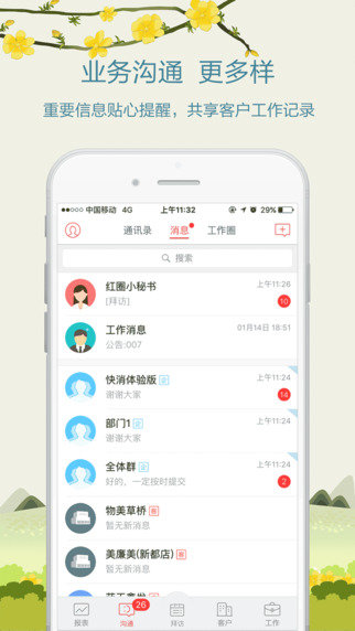 3.丰富又灵活的沟通方式 通过公告、沟通IM、工作圈,轻松实现团队协作,及时有效采取行动并获得执行反馈,团队动态尽在掌握。贴心的“红圈小秘书”,还不忘实时提醒您需要关注的工作和结果。