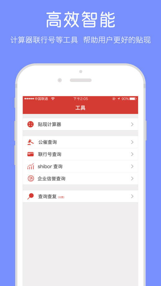 【辅助工具】提供贴现计算器、银行联行号查询、公示催告查询、Shibor查询等功能,方便实用。