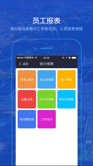 给老板 -部门考勤智能分析:每天、周、月考勤信息智能生成图表,让部门考勤更直观; -员工考勤智能展示:员工勤快榜、迟到榜等,时时查看,让管理员工更高效; -移动审批管理:员工出差、请假、加班等复杂流程审批,手机轻松搞定;