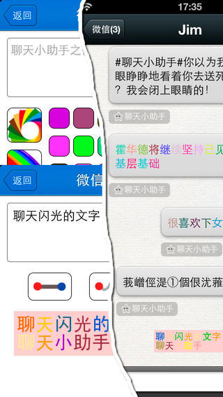 生成彩色闪光文字,包含渐变闪,单色闪,波浪闪,随机闪,动态图片可发送到微信 对话中,朋友圈.支持QQ,微博,陌陌,Facebook,Twitter,Line等,适用于所有手 机客户端,所有支持动态图片的APP.