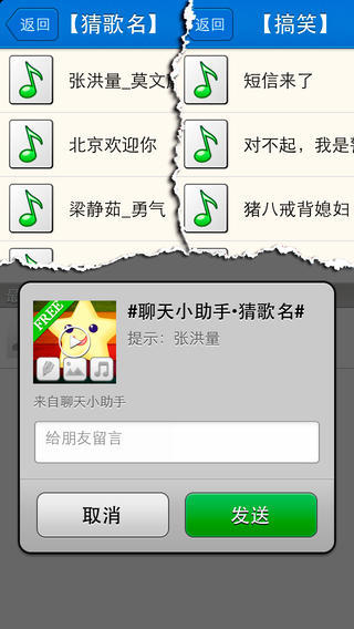 ①猜歌名 首创提示歌手名,听音乐前奏进行猜歌名,在线数千首歌曲可供挑选,想 要报KTV里所谓的麦霸那一箭之仇,赶紧向那个不够格的麦霸挑战吧. ②搞笑语音 神曲,周星驰经典,卡通动画配音,小品,怀旧影视,明星经典语录,应 有尽有,还有语音拜年哦.