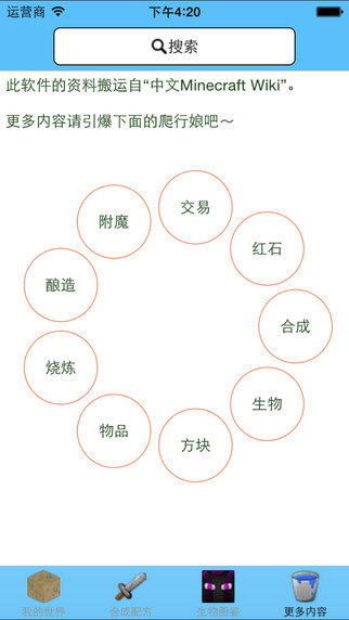 MC合成配方是一款生成图鉴、合成配方、我的世界等模块于一体的辅助类应用,专为我的世界游戏打造。感兴趣的伙伴儿们,快来点击下载吧!