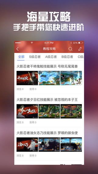 火影忍者手游攻略是一款为火影忍者手游打造的辅助工具。通过该软件,广大用户可以一手掌握了解更多与火影忍者手游有关的攻略、资讯等。