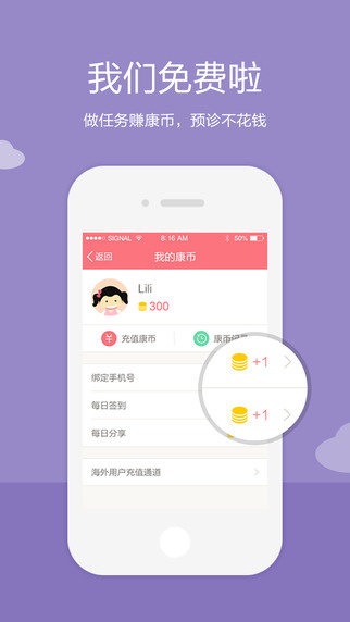 我的康币 在我的康币中提供了丰富的康币任务,通过绑定手机号、每日签到、每日分享就可以轻松领取康币。康币可用于指定医生预诊和送花给医生。