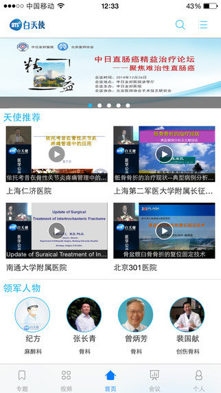 白天使公开课—医生的移动课堂,手机里的医学教育专家,聚集了北京上海等重点城市的顶级名医的精华医学教育课程以及顶尖医学专家的专访内容,视频涵盖了内外妇儿等主要临床科室,为医疗从业者,提供最新的医学技能,最权威的医学专家讲座,每月上线数百场医学会议视频。
