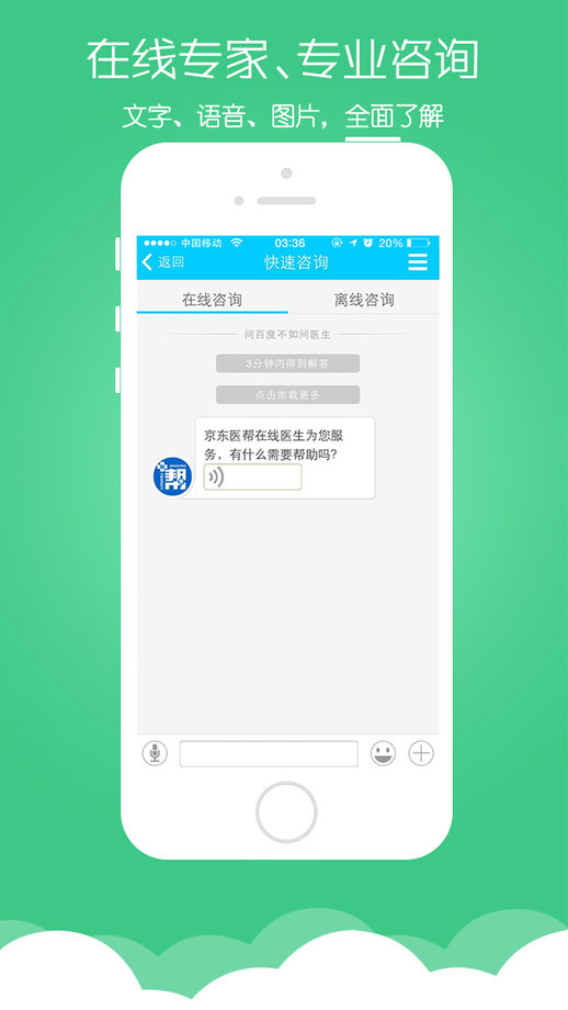 快速咨询:打开应用,能够在首页找到“快速咨询”的入口,用户点击进入后,即可与医帮医生进行对话,解答疾病困惑。