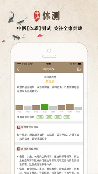 【体质测试】:标准体质测试,迅速了解自身体质,提示可能发病倾向,还能添加多个成员信息,根据测试结果打造专属养生秘方:膳食调养、穴位保健、运动保健全知道;