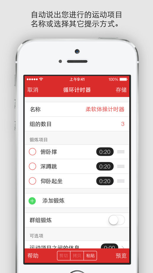 •内置高强度间歇性训练(HIIT)、Tabata训练、循环训练等模板