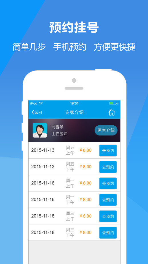 【预约挂号】提供本院所有科室门诊预约,患者只需一部手机,即可完成预约挂号并在线支付挂号费,而且可以随时随地查看叫号信息。