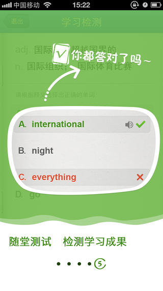 2、任务式的流程,短时间内最深刻的记忆。 新词学习、往日复习、随堂测试,有了最科学的艾宾浩斯记忆曲线给你布置作业,还心虚什么?