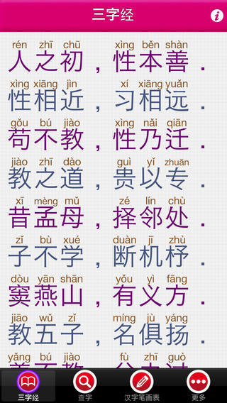 《三字经》,是我国知名度极高的儿童读物,流传广泛,家喻户晓,在中国古代蒙书教材中是影响最大、最有代表性的书。 为了帮助儿童学习《三字经》,本软件为其中每个字增加拼音标注及汉字书写的功能。学习三字经过程中,可通过拼音识字,通过汉字笔顺学习并牢记汉字文化。