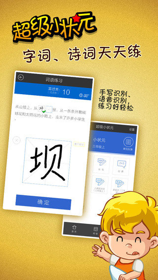 超级小状元是一款儿童教育辅助软件。超级小状元软件是小学辅助学习神器,直接手写练听写,搞笑错题本,字词、诗词天天练。超级小状元是用于小学阶段学习的辅助工具软件。利用移动设备提供的先进便利的学习方法,反复练习加深记忆,配合课堂教学巩固知识点。