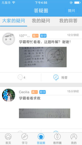 3.答疑圈的奥秘:在问酷答疑圈里,平均每一次提问都能收获4-6次解答!可能是同类学习软件中活跃指数No.1的学习圈子。