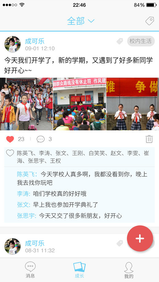 米学支持发布通知可查看家长阅读情况;图文结合发布作业;班级群聊、自建小组聊天,单聊等等。