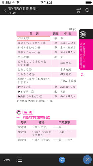 该APP共由26篇小课文组成,每课均设有基本句型和会话,专为中文环境中的日语学习者而设计。本APP以轻松活泼的语言,让你快速掌握日语基础语法,让大家可以随时看、随身记,拿起来就放不下!同时本APP还在每课语法点后均配有丰富的例句和精选练习题,让你一练就会,一考就过!
