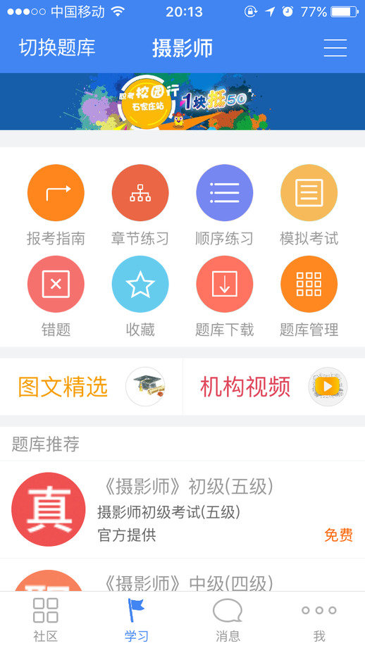 摄影师学堂是为摄影爱好者及从业者提供的学习、考试、交流的平台,提供摄影技术分享、考试进阶题库、摄影教学视频、交流讨论等功能。