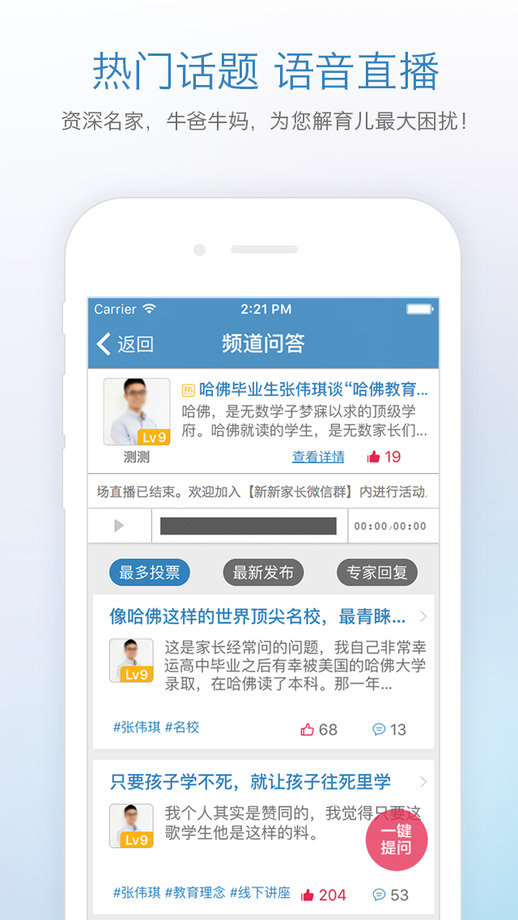 新新家长是一款教育软件,专为您解决孩子教育问题,包括学习成绩、兴趣培养、升学择校、性格习惯、出国留学等所有问题的家长教育社区。每天围绕不同主题的教育干货、教育话题、专家问答,在这里找到孩子教育的最佳方案、向过来人家长取经、向资深的教育专家咨询,在这里,为您在孩子教育路上提供最有效的帮助。