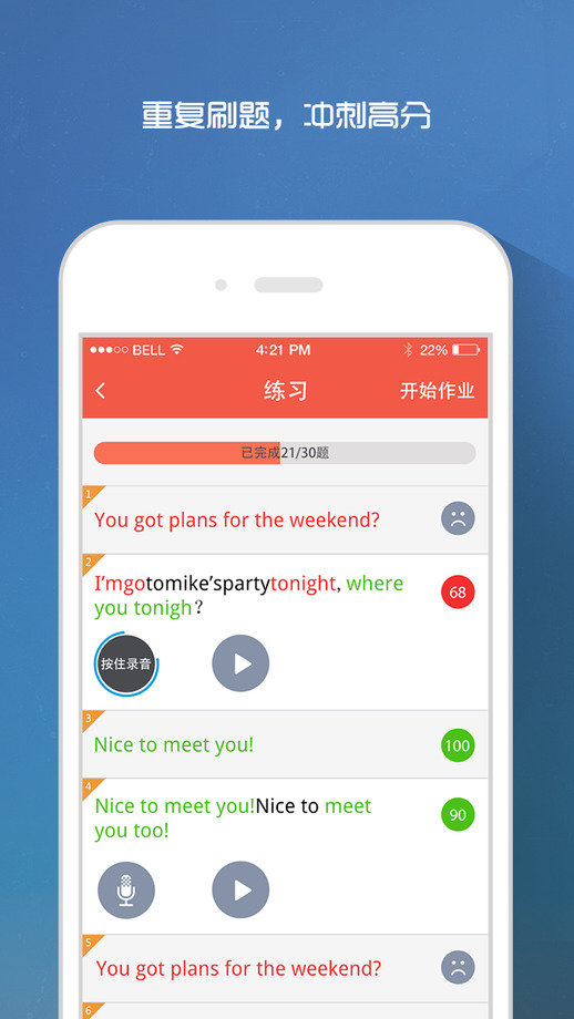 口语作业是一款协助老师发布英语作业,做口语评测、成绩统计分析于一体的学习应用,提高老师的工作效率,方便老师随时帮助学生会学习。内置强大的语音识别技术,精确到每一个单词,答题情况实时反馈给老师,录音回放,自动评分。该应用旨在提高学生的口语能力!