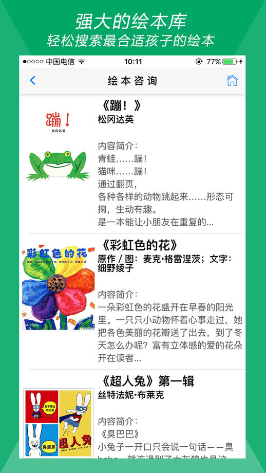 绘本咨询:强大的绘本库,根据您孩子的年龄性别推荐最合适阅读的绘本。