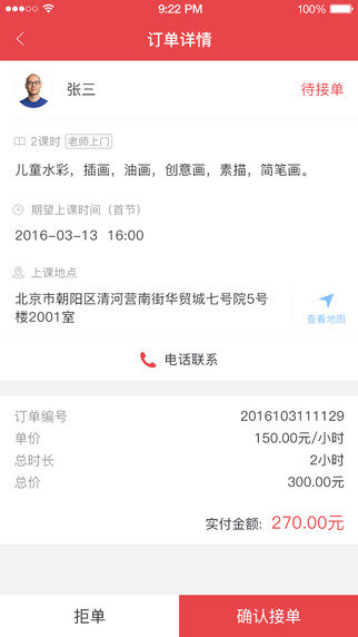 3、订单:学生买课后,您可查看到新的订单,进行接单操作,并在订单详情页为学生安排上课时间。
