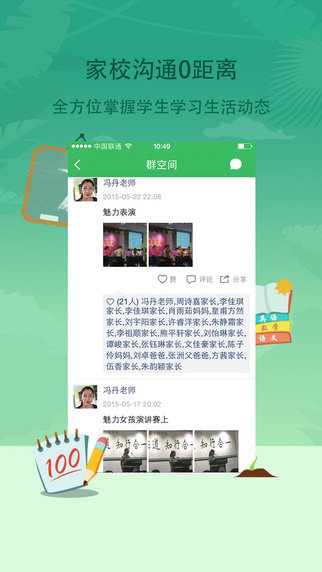 【班级群】–安全免费的家校沟通平台,家长与老师可以随时随地交流,省时高效;学生的作业、通知、评语、考勤,考试成绩等各类信息,教师一键发送,家长一键签收;群空间记录分享孩子学习、生活历程,传递正能量。