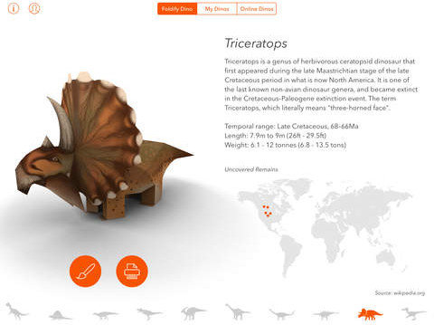 进入应用后,我们可以看到里面内置的恐龙模板,如果你是一个恐龙控,那么看着这些应该如数家珍,除了模型之外,还会显示出它们的活动区域和详细的资料,不过都是英文。选一种自己喜欢的恐龙,点击后即可进入编辑页面,应用充分利用了iPad的宽大屏幕,编辑页面被划分为两块区域:右侧为纸模展开图,是用户主要编辑的地方;左侧为纸模立体图,编辑的效果会随时在这里呈现,以供用户进行参考。