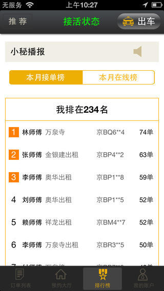 打车小秘司机版是一款专为司机打造的软件。在这里你可以快速的接单,一键抢单安全便捷。信息呈现清晰,乘客位置、乘客联系方式一目了然;接单后实时语音对话,和乘客零距离沟通;预约大厅抢单流程,承接更多预约订单;司机个人账户,随时查看司机积分、排名等信息,完善的信用体系;最专业最负责的客服为您服务。