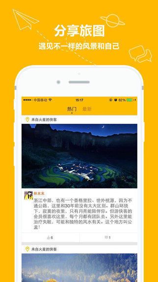 游侠客是一款提供旅游搜索便捷服务软件。当我看到这种旅游便捷服务的软件的时候都会非常想把它下载下来,觉得对我们的用处挺大,能够给我们带来十分便捷的旅游。提供特色旅游目的地的深度搜索和便捷预定、记录分享旅行见闻的旅行社交APP。致力于打造全方位个性化旅游体验,让您随时随地来场说走就走的旅行。重要的不是去哪儿,而是和谁一起去,游侠客APP,旅行者的必备行囊。