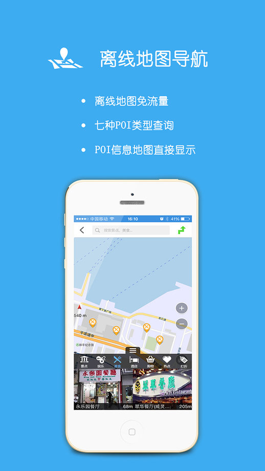 可实现周边搜索、POI查询、定位、路线规划(驾车、步行),