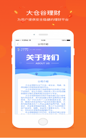 大仓谷投资app是一个专业的投资理财平台,为用户提供贴心的理财服务。投资理财资讯实时更新,帮助用户实现财富增长,喜欢的朋友赶紧下载体验吧。