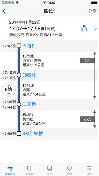 2.路线查询 选择出发,到达,时间,即可获得多种换乘方案。包含:路线,时间,票价,距离。