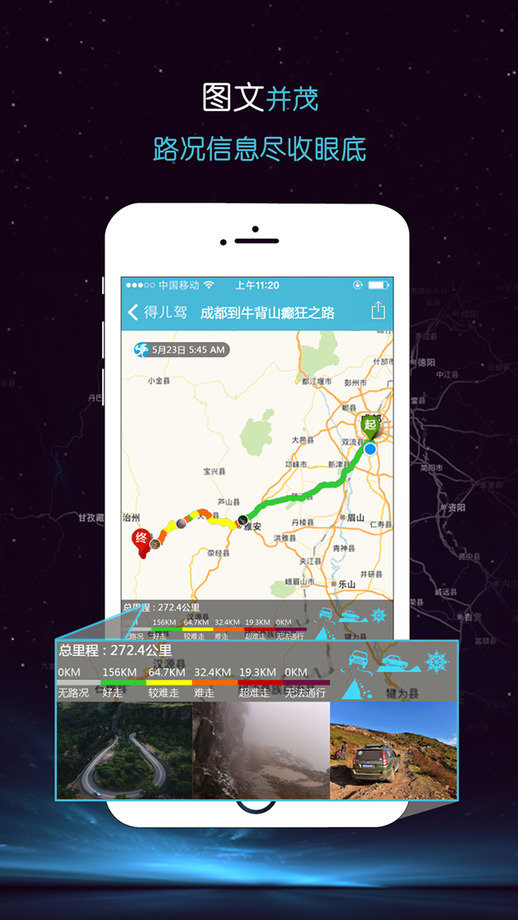 系统自动生成整条路线的路况信息图,包括各种等级路面的里程、重要路况节点的现场照片及整条路线的路况说明。方便用户分享到朋友圈以及其它自驾游网站,也便于职业自驾游者做路线的路况介绍。