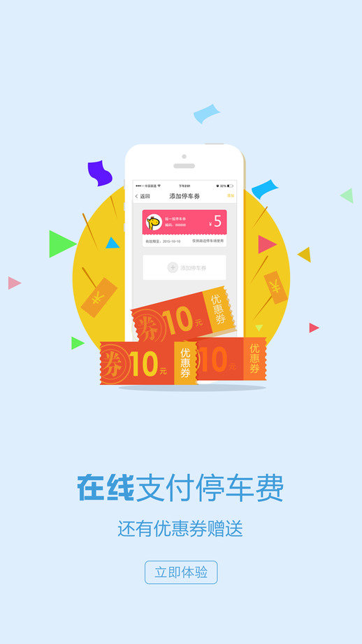 4、可通过APP添加停车优惠券,用户添加的优惠券可在缴停车费时,自动抵扣停车费,简洁高效。不再需要传统的给用户发放纸质优惠券,再让用户去服务台兑换停车票的方式。